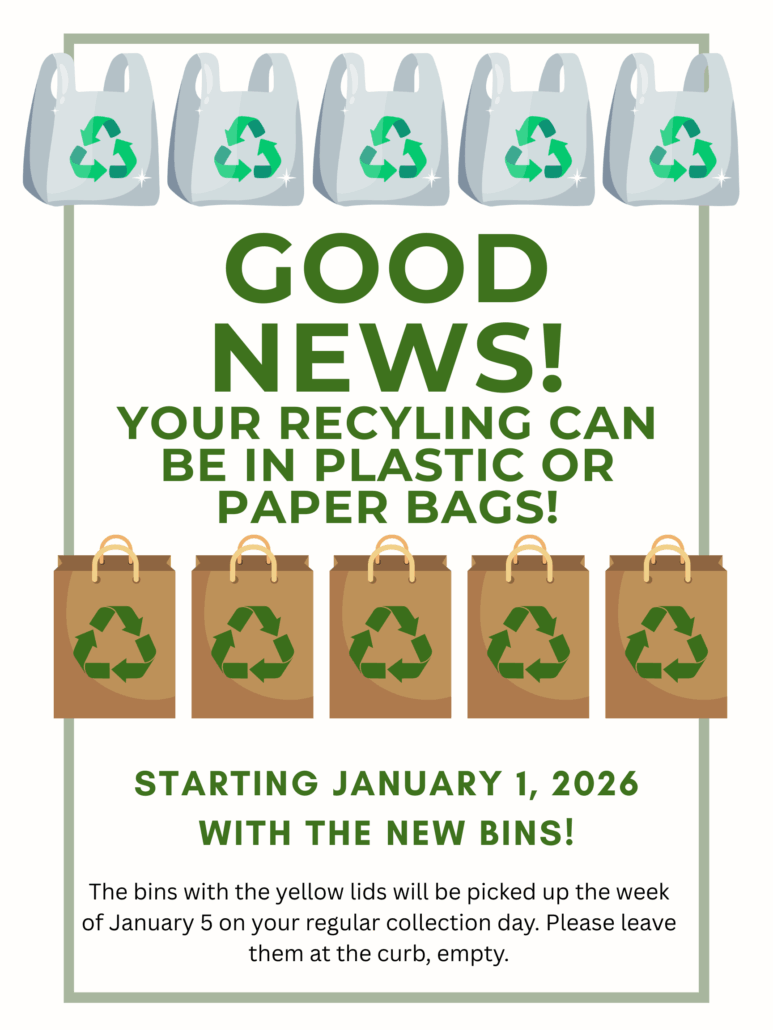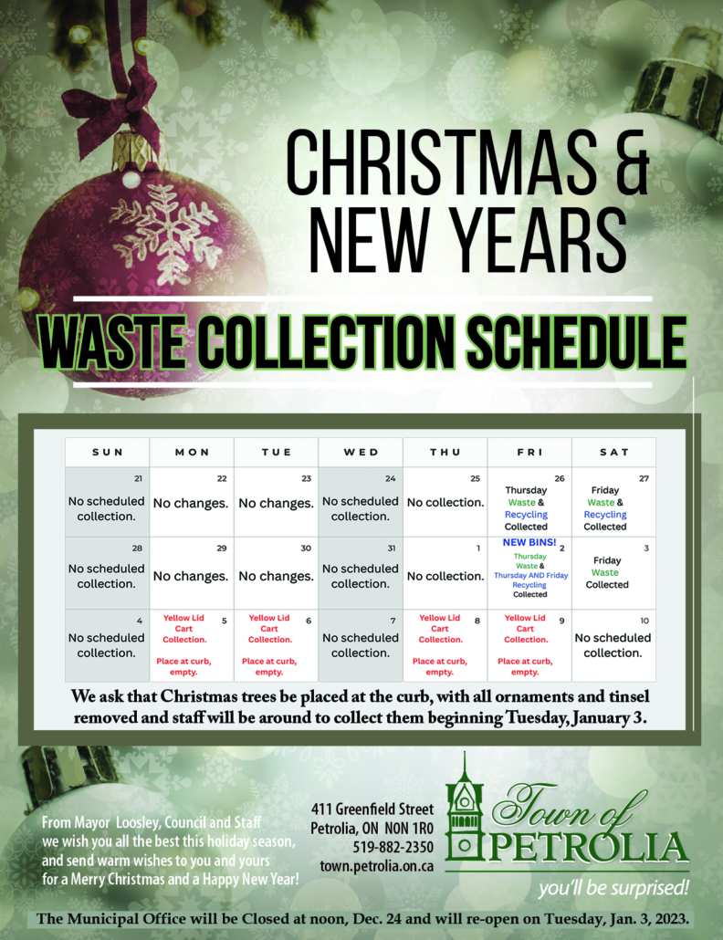 As part of Ontario’s transition to a new extended producer responsibility (EPR) blue box program, the local recycling collection contractor in Petrolia is changing as of January 1, 2026. The new recycling collection contractor, Emterra, will be using recycling bins, not carts, for recycling collection in Petrolia.