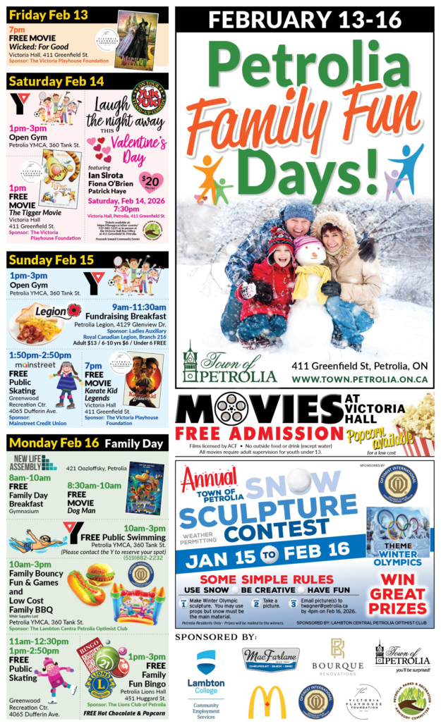 Throughout the months of January and February, the annual Snow Sculpture Contest is part of the fun! This year, the contest will run until Monday, February 16 at 4:00 p.m. The theme is “Winter Olympics”, and residents are encouraged to be creative using props, paint and more, but are reminded that the main ingredient must be snow. The Lambton Central Petrolia Optimist Club is sponsoring the prizes for this event. Please e-mail your submissions to twagner@petrolia.ca by 4:00 p.m. on Monday, February 16.