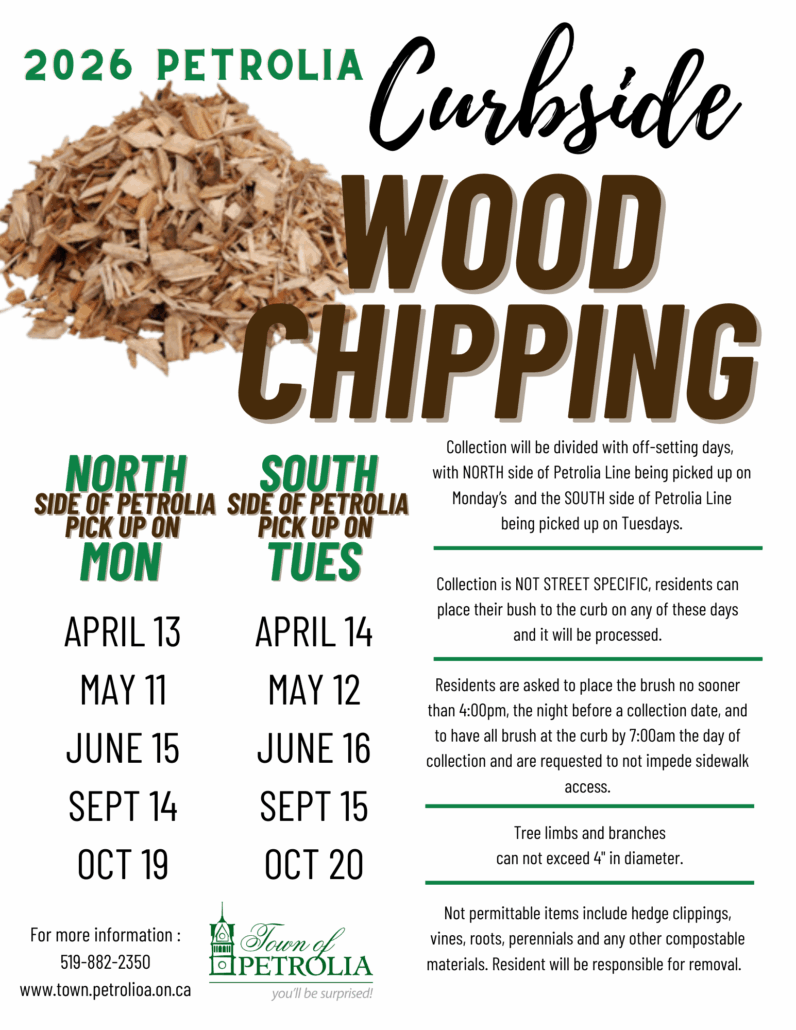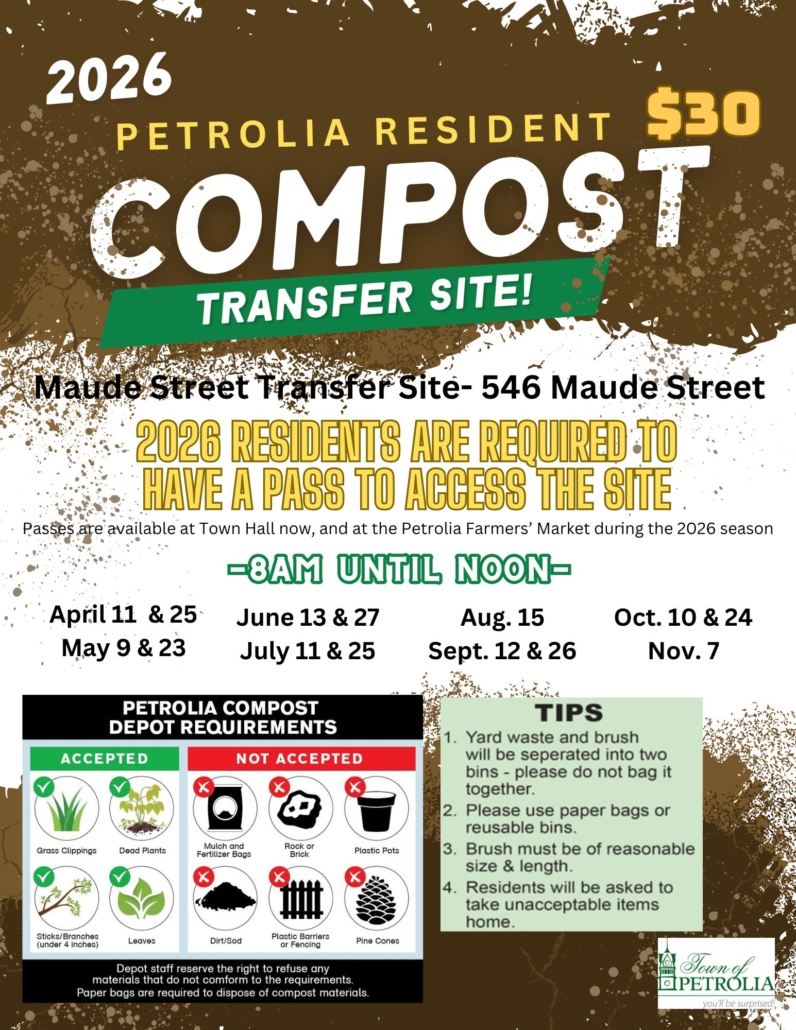 Residents may bring items in paper bags or reusable bins; no plastic bags will be accepted. Residents with unacceptable items will be asked to take them home. CONTACT INFORMATION: Ministry of Environment, Conservation and Parks (MECP’s) Spills Action Center telephone number- (416)325-3000 or 1(800)268-6060 Operating Hours 8:00 a.m.-12:00 p.m. Town of Petrolia Emergency Phone Number- (519)882-2351 Resident Feedback https://town.petrolia.on.ca/governance/citizen-engagement-comment-form/